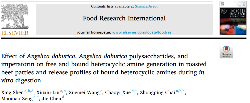 近日,星空彩票体彩版资源与环境学院柴仲平教授研究团队联合江南大学食品科学与技术国家重点实验室曾茂茂教授研究团队在国际知名学术期刊Food Research International发表了题为 “Effect of Angelica dahurica, Angelica dahurica polysaccharides, and imperatorin on free and bound heterocyclic amine generation in roasted beef patties and release profiles of bound heterocyclic amines during in vitro digestion” 的研究成果。该研究揭示了白芷(Angelica dahurica, AD)、白芷多糖和欧前胡素对烤牛肉饼中游离和结合态杂环胺(HAs)形成的影响,为食品安全和人们的健康饮食提供了新的科学依据。