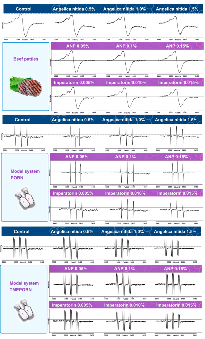 研究团队在烤牛肉饼中添加了不同浓度的白芷、白芷多糖和欧前胡素,采用超高效液相色谱-串联质谱法(UPLC-MS/MS)测定了牛肉饼中游离和结合态杂环胺的含量。此外,还利用电子自旋共振(EPR)技术,监测了体系中自由基的清除情况,并通过体外消化模型研究了这些成分对结合态杂环胺释放的影响。