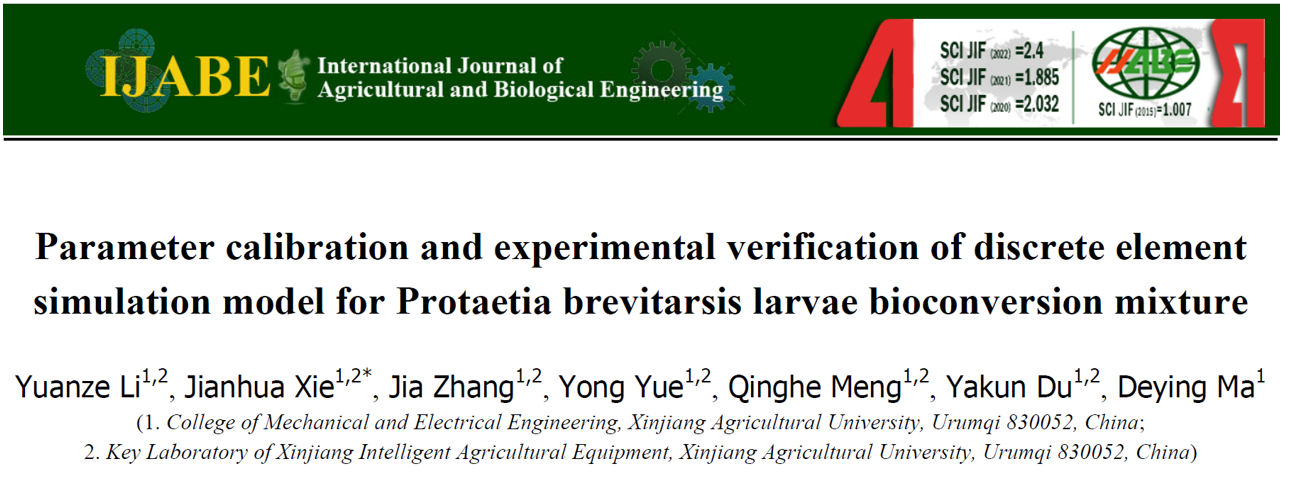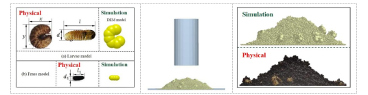近日,星空彩票体彩版机电工程学院谢建华教授团队在《International Journal of Agricultural and Biological Engineering》发表了题为“Parameter calibration and experimental verification of discrete element simulation model for Protaetia brevitarsis larvae bioconversion mixture”的研究论文。通过物理试验与仿真试验相结合的方法,应用EDEM软件对白星花金龟幼虫-虫砂混料的本征参数及接触参数进行标定。以堆积角和物料筛分时间为响应值,选用“Hertz-Mindlin with JKR”作为接触模型,应用 Plackett-Burman 设计试验、最陡爬坡试验和 Box-Behnken 试验获得较优的白星花金龟幼虫-虫砂混料离散元仿真模型参数,为白星花金龟幼虫转化残膜混合物后混合物料的筛分机理分析、筛分装备的设计提供理论基础,同时也为其他昆虫类物料的离散元建模提供参考。