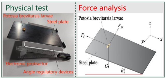 通过斜面滑动/滚动试验测得白星花金龟幼虫-虫砂与钢的静摩擦系数分别为0.325/0.625、动摩擦系数为0.435/0.167;通过自由落体碰撞试验测得白星花金龟幼虫-虫砂与钢的碰撞恢复系数分别为0.223/0.387;通过细线悬挂碰撞试验测得幼虫间碰撞恢复系数为0.185。