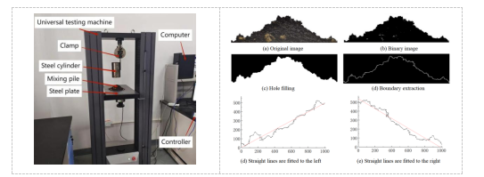 通过万能试验机对白星花金龟幼虫-虫砂混料进行圆筒提升试验,获得白星花金龟幼虫-虫砂混料的实际堆积角,利用高清相机拍摄混料的前视图像,将前视图像导入Matlab软件进行灰度处理、二值化处理、孔洞填充、提取边界轮廓操作后,将轮廓图导入Origin软件后获取轮廓各点坐标值,再将轮廓坐标值转化为点线图并进行线性拟合,获得堆积角实际数值为27.67。