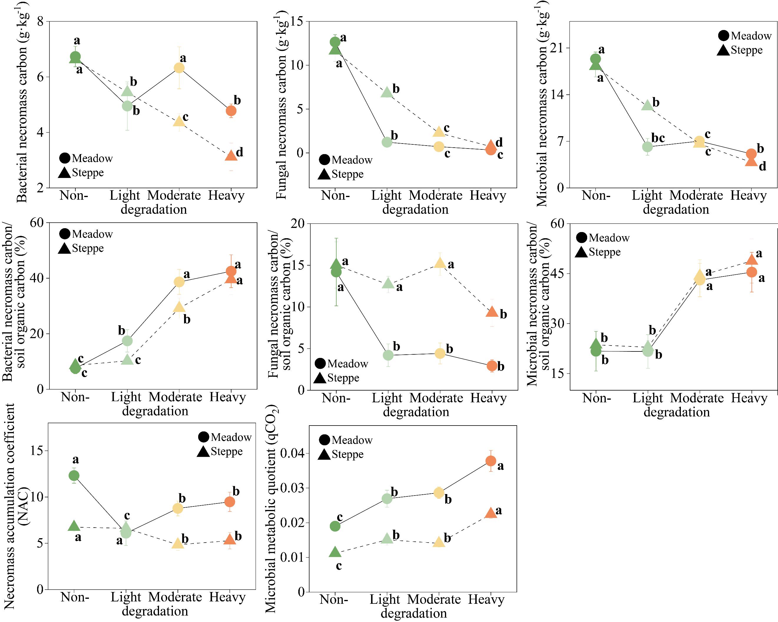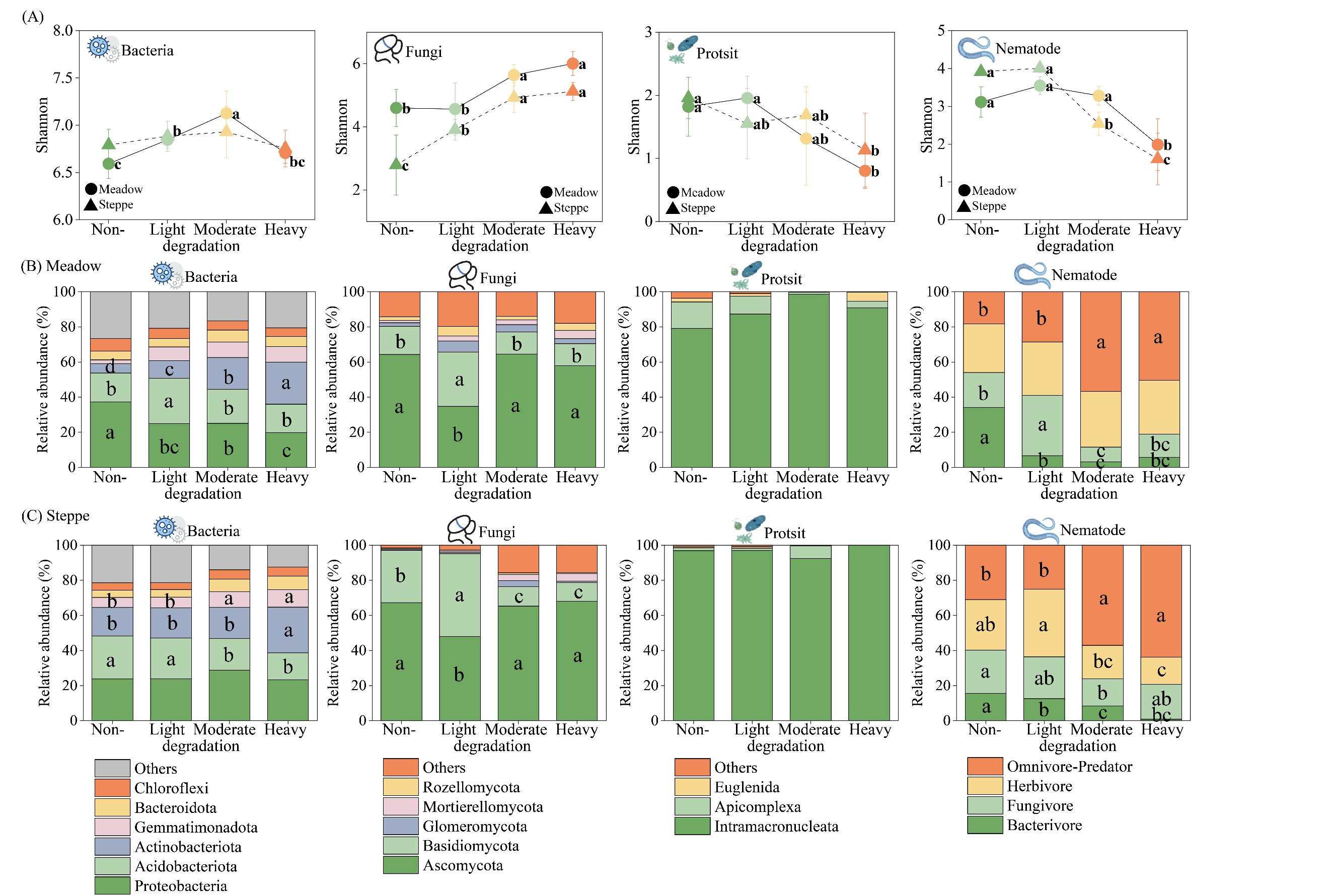 草地占全球土壤有机碳的约20%,然而由于人类活动压力和气候变化引起的草地退化导致土壤有机碳储量正在下降。了解草地退化过程中土壤有机碳损失的机制对于制定减缓草地生态系统CO2排放的策略至关重要。土壤中栖息着的多种生物,彼此相互作用组成了复杂的微食物网,微食物网内生物的个体活动和相互作用深刻影响着土壤有机碳过程。然而,人们对草地退化过程中微食物网的变化及其与土壤有机碳动态的之间的关系仍然知之甚少,这阻碍了对草地生态系统中土壤有机碳动态的预测。
