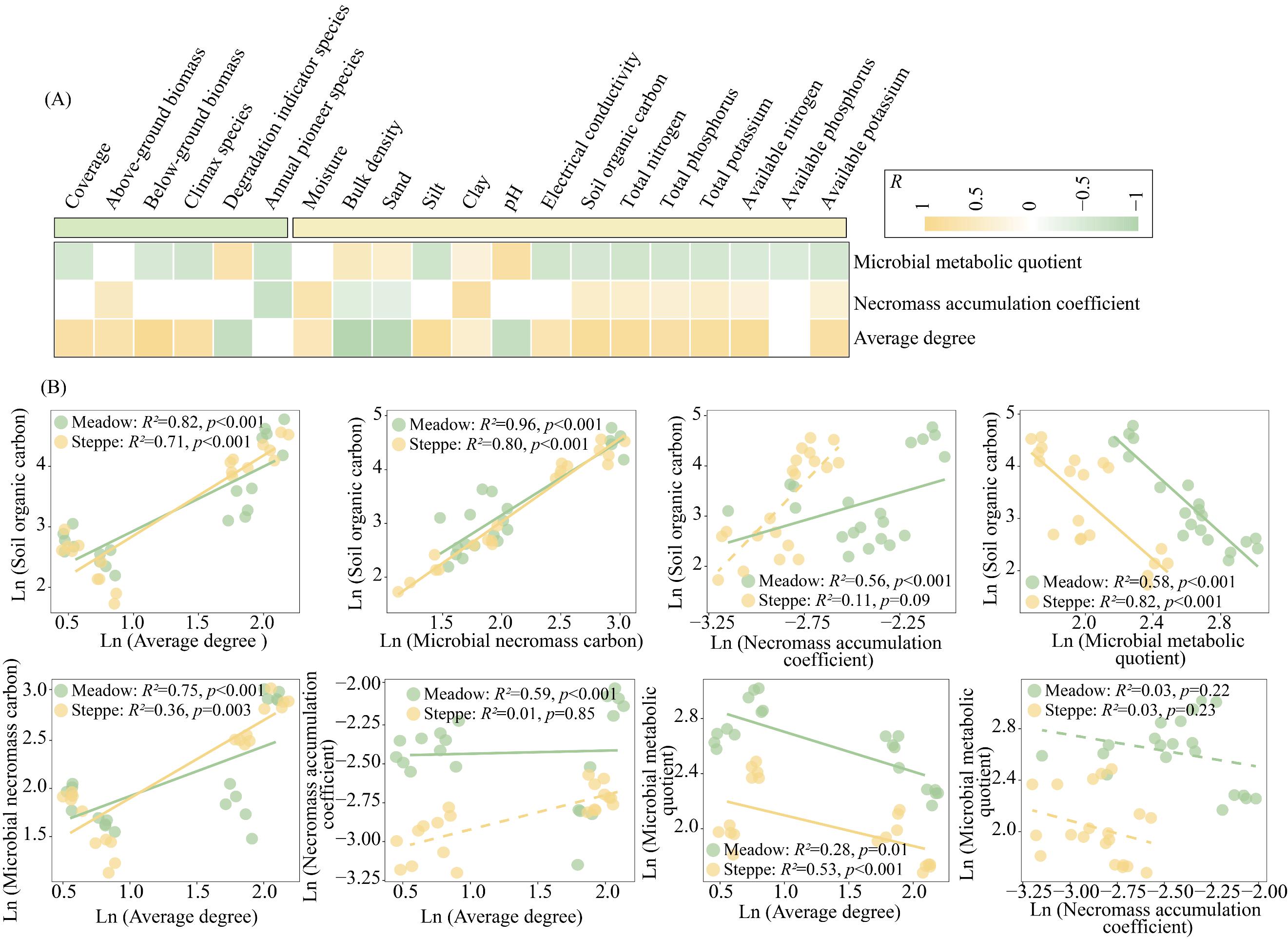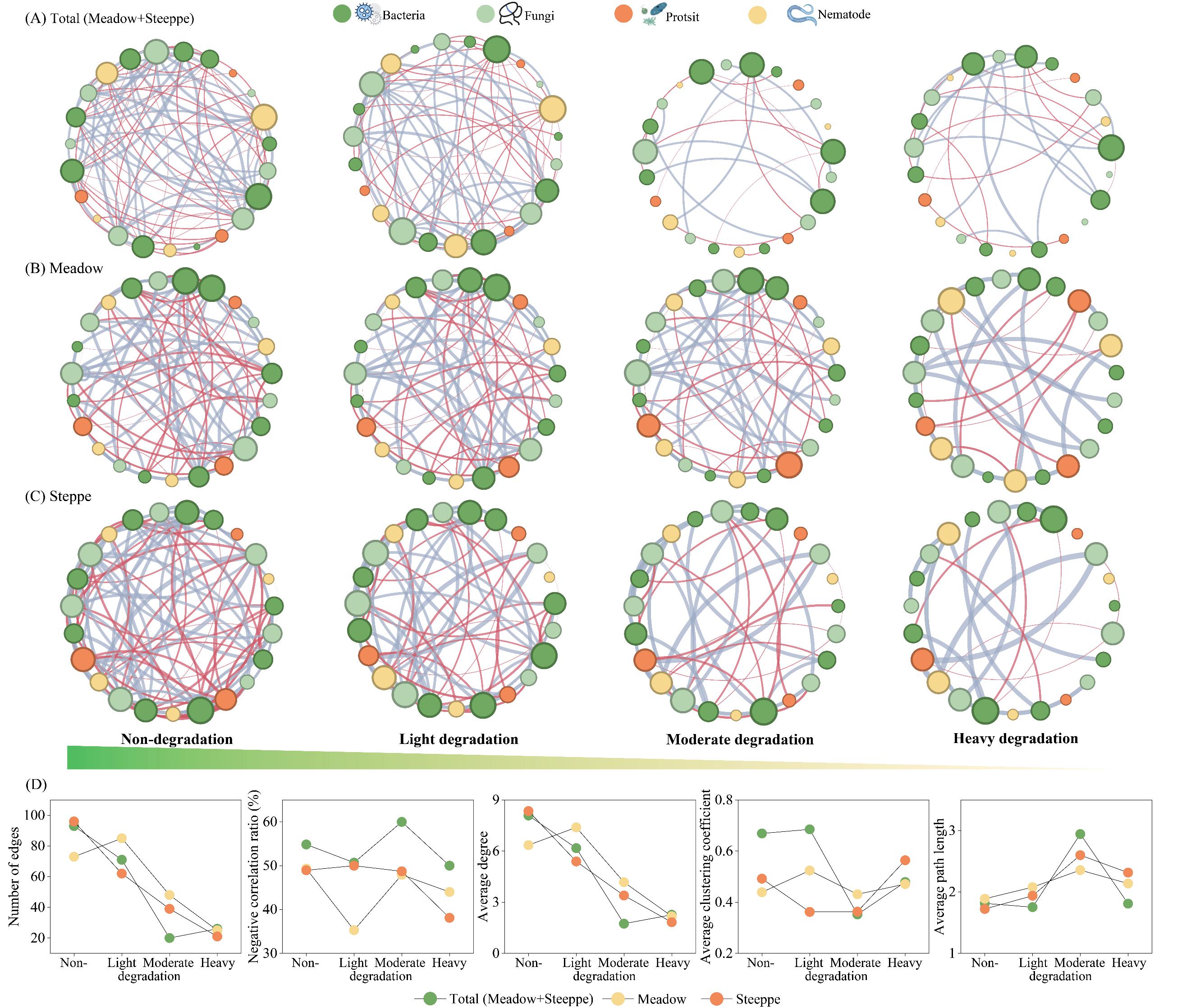 土壤微食物网在维持土壤碳循环和碳储量方面发挥着重要作用,然而草地退化会破坏微食物网预计会减少土壤碳储量。为此,研究团队依托星空彩票体彩版在干旱区高山草甸和草原上建立的退化样带对这一假设进行了检验,揭示了土壤多营养级生物和微生物代谢效率如何应对草地退化及其与土壤有机碳之间的关系。研究主要发现:草地退化降低了微生物残体积累系数(即微生物残体碳与微生物生物量碳的比值),增加了微生物代谢熵(即土壤呼吸速率与微生物生物量碳的比值),表明微生物可能会优先分解有机碳以获取资源,而不是生长和残体的积累。此外,草地退化增加了细菌和真菌的多样性,减少了原生动物和线虫的多样性,并简化了微食物网的结构(即网络的复杂性)。总体而言,草地退化降低了微生物的代谢效率,这与植物生物量的减少、土壤黏粒的降低和微食物网的简化相关(特别是微生物、食微线虫和捕食线虫之间的联系的减弱),这些潜在的引起退化草地土壤中有机碳的损失。这些发现为了解土壤微食物网介导的土壤有机碳动态提供了独特的见解,并强调了有必要维持土壤微食物网结构以促进退化草地的土壤碳储量恢复。