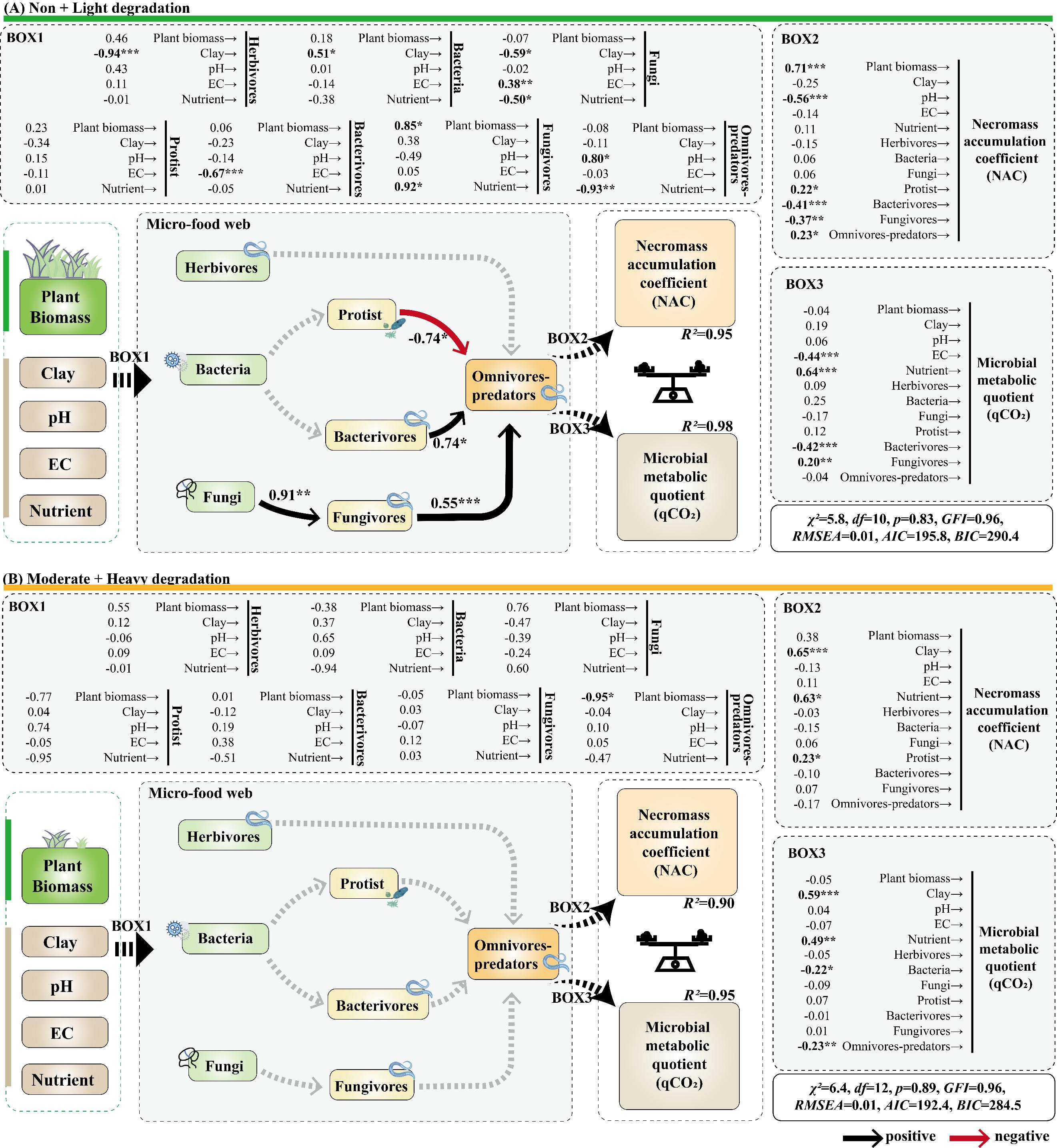 综上,草地退化导致的植物资源输入、黏粒含量和微食物网复杂性的降低,可能会阻碍微生物的代谢效率,表现为微生物坏死物质积累系数的降低和微生物代谢熵的增加,从而可能导致退化草地土壤有机碳的损失。这些发现为了解土壤微食物网介导的土壤有机碳动态提供了独特的见解。鉴于本研究依赖于相对丰度的数据,未来的研究应考虑使用同位素碳和氮追踪来研究微食物网内的营养级联效应。此外,通过控制、添加或移除特定生物来操纵它们,也有助于明确其确切的生态作用。