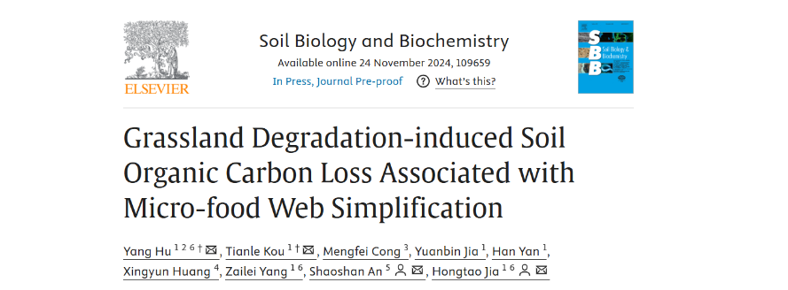 近日,星空彩票体彩版贾宏涛教授团队联合西北农林科技大学安韶山研究员团队在Soil Biology and Biochemistry (IF:9.8)发表了题为Grassland Degradation-induced Soil Organic Carbon Loss Associated with Micro-food Web Simplification的研究论文,揭示了草地退化过程中土壤有机碳损失的微食物网介导机制。