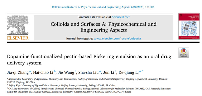 Abstract: Pickering emulsions can be utilized to improve the usage efficiency of water-insoluble drugs as oral drug deliverysystems. The present study showed a series of dopamine-functionalized pectin-based Pickering emulsions foranti-inflammatory medication, The dopamine functionalization induced significant differences in wettability,zeta potential, particle size, and PDI value compared with the oxidized pectin. The resultant Pickering emulsionsconsequently had excellent stability and could be stored for 30 days. Moreover, the morphology of the driedPickering emulsions was all nano-scale spherical particles, Indomethacin (IND) was used as a water-insolubledrug model. The resultant Pickering emulsion-based drug delivery system showed persistent release of IND formore than 12 h, high pH-responsiveness, and biocompatibility, All the results manifested the excellent potentialof dopamine-functionalized pectin-based Pickering emulsions in drug delivery applications, The present workalso provided a new approach to preparing Pickering emulsions from modified anionic polysaccharides fordelivering the water-insoluble drugs.