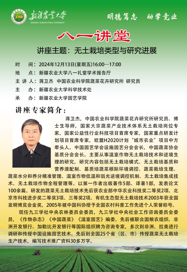 【八一讲堂预告】八十三期:无土栽培类型与研究进展