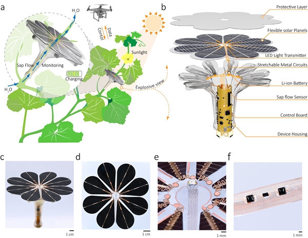 从外观看,仿生植物可穿戴传感器像是一朵开放的“太阳花”,重量仅40克,传感器可以伸缩,适应不同粗细的植物茎秆。常规传感器在使用过程中需要外接设备支持,如电源、控制系统、通讯等,但该系统集成可折叠太阳能电池板,整合所有必要柔性电子组件,形成一个紧凑、轻便的系统,适用于农作物等小型植物。