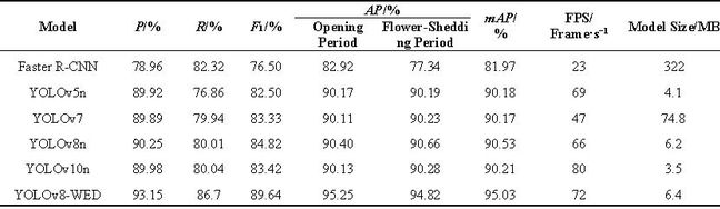 为评估WED-YOLO检测红花丝的效果。在相同条件下,使用红花丝训练集训练Faster R-CNN、YOLOv5、YOLOv7、YOLOv8、YOLOv10、WED-YOLO检测模型。红花丝测试集用于评估上述6个检测模型的检测效果。表2列出了这6个检测模型的性能比较。结果表明,WED-YOLO模型的召回率、AP和mAP显著高于其他模型。WED-YOLO模型在小尺寸红花丝检测中的表现优于其他模型,具有出色的综合检测性能。