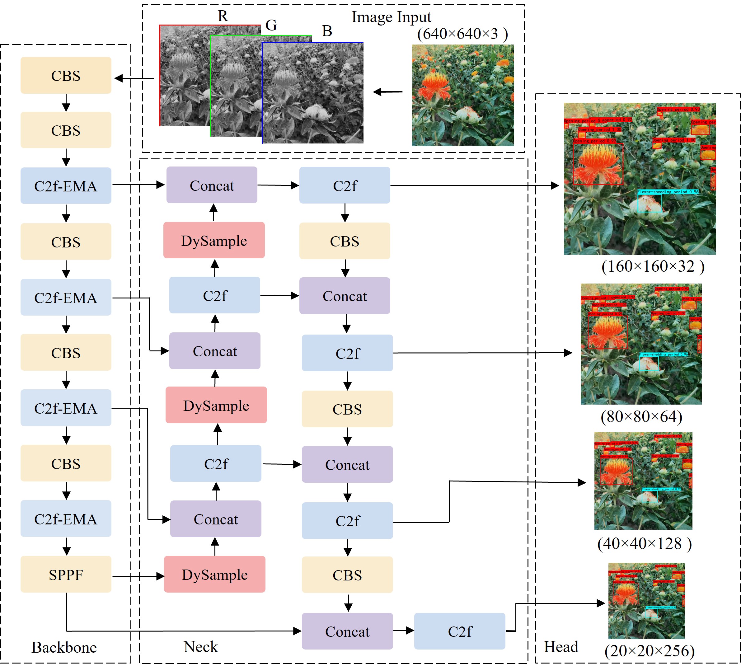 WED-YOLO的网络结构图如图1所示。该网络引入C2f-EMA模块,通过多尺度注意力机制和跨空间学习提高对复杂背景中红花丝特征的提取能力。为更好地拟合小目标边界框,网络采用了WIoU作为损失函数,该函数通过动态加权方式增强了小目标的定位精度。使用DySample模块替代传统的上采样方法,优化低分辨率或远距离图像中小目标的细节恢复。最后,网络在检测头部加入了专门的小目标检测层,进一步提升红花丝等小目标的检测精度。