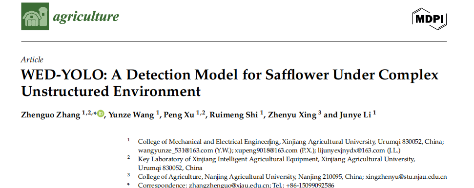 星空彩票体彩版机电工程学院张振国副教授团队在权威杂志《Agriculture》在线发表一篇题为"WED-YOLO: A Detection Model for Safflower Under Complex Unstructured Environment"的研究论文。该研究提出一种改进的YOLOv8模型WED-YOLO,旨在提高红花丝在复杂环境中的检测精度。该模型为应对小目标红花检测中常见的困难,引入了如下几个重要的技术改进:首先,使用Wise Intersection over Union (WIoU) 损失函数替代传统的IoU损失函数,WIoU能更好地处理不同尺寸目标的边界框拟合问题,尤其对于像红花丝这样的小目标,能够有效提高定位精度。其次,在模型的颈部网络中使用DySample模块替代传统的上采样方式。该模块通过动态点采样技术改善图像上采样的精度,特别是在低分辨率或远距离视角下,能够有效减少特征丢失,提高小目标的检测能力。此外,C2f-EMA模块引入高效多尺度注意力机制,增强主干网络的特征提取能力,进一步提升模型在复杂背景下的表现。最后,WED-YOLO在检测头部加入了专门针对小目标的预测层,以解决传统模型难以捕捉红花丝等小目标细节的问题。