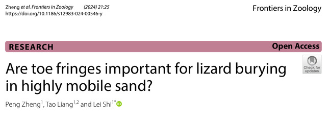 Abstract: Toe fringes are a key innovation for sand dwelling lizards, and the relationship between toe fringe function and substrate properties is helpful in understanding the adaptation of lizards to sand dune environments. We tested the sand burial performance of Phrynocephalus mystaceus on different sand substrates with toe fringe manipulation, with the aim of assessing whether the function of the toe fringes shifts under different substrate properties, especially in highly mobile substrates. The sand burial performance of P. mystaceus was influenced by substrate properties in relation to the toe fringe states of the lizard. After removal of the bilateral toe fringes, the sand burial ability score of P. mystaceus was significantly higher on sand substrates below 100 mesh than on native sand substrates. As the angle of stability of the substrate properties decreased, the sand burial performance of the lizard was even better after the bilateral toe fringes were removed. The results of the LASSO model and the path anaysis model showed that the stability angle provided the opposite effect on sand burial performance in different toe fringe states. These results further suggest that the sand burial function of toe fringes may not be suitable for highly mobile sand substrates. It remains to be tested further whether the function of toe fringes is more important for running on sand.