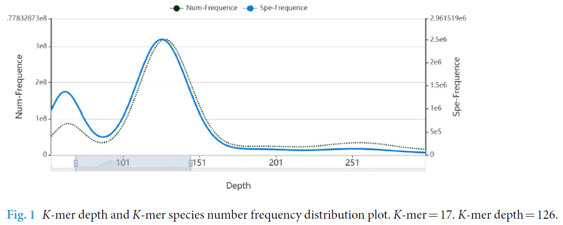 研究人员利用DNBSEQ-T7平台对‘晚丰’扁桃叶片进行测序,获得了50.29 Gb的二代原始数据。K-mer分析预测‘晚丰’扁桃基因组大小为288.08 Mb,杂合度为0.81 %,重复序列比例为50.98 %(图1,表1)。