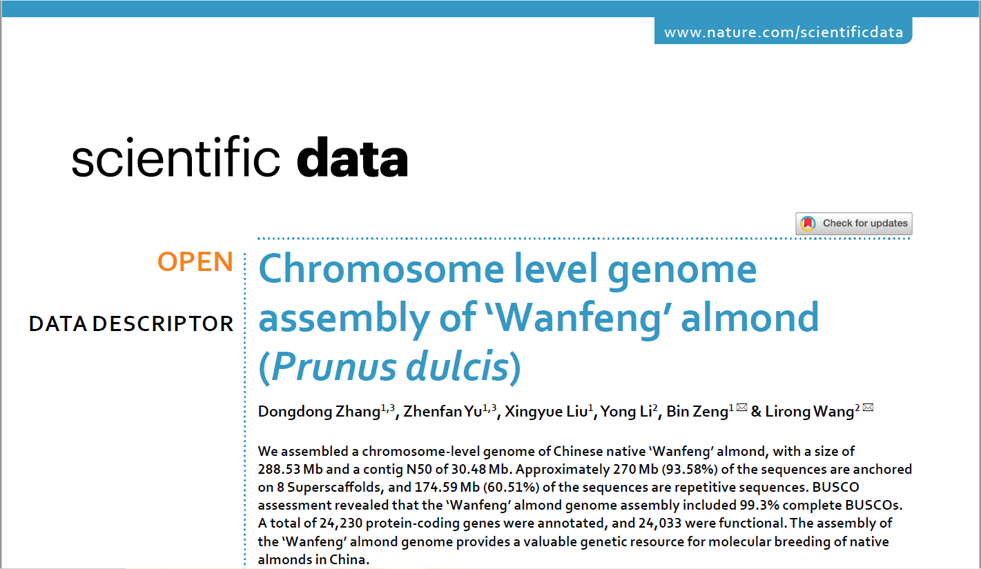 近日,星空彩票体彩版曾斌教授团队在《Scientific Data》发表题为“Chromosome level genome assembly of ‘Wanfeng’almond (Prunus dulcis)”的研究型论文,该研究对‘晚丰’扁桃基因组在染色体水平上进行精确的测序与组装分析,为中国地方扁桃的分子育种提供了宝贵的基因资源。