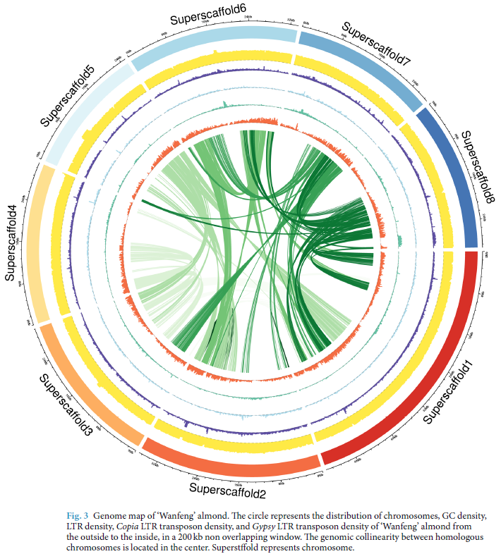 扁桃(Prunus dulcis)是世界范围内广泛种植的重要蔷薇科扁桃亚属经济果树,是世界四大干果之一。扁桃自唐朝开始在中国栽培,至今已有1300多年的历史。中国新疆喀什地区是栽培扁桃植物的主要产区,拥有丰富的扁桃资源,包括‘多果’、‘双软’、‘晚丰’、‘纸皮’、‘鹰嘴’和‘双果’等。过去几年,欧美相关研究机构已对‘Lauranne’、‘Texas’和‘Nonpareil’等3个扁桃品种的基因组进行了均采用二代测序技术进行基因组测序和组装分析,并取得了重要成果。近期,星空彩票体彩版园艺学院扁桃研究课题组对中国新疆本土栽培扁桃‘晚丰’品种采用更为先进的第三代测序技术进行染色体水平高质量基因组测序和组装,并将基因组数据公布在中国国家生物信息中心(BioProject ID: PRJNA854307)因此,对中国地方扁桃品种进行基因组测序和组装势在必行。