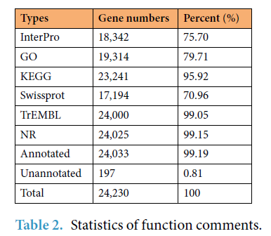 最终,‘晚丰’扁桃基因组大小为288.53 Mb,contig N50和scaffold N50分别为30.48 Mb和31.36 Mb,约270 Mb的序列锚定在8个Superscaffolds上,在‘晚丰’扁桃基因组中共预测到24230个蛋白编码基因(表2,图3)。此外,还鉴定到225个miRNA、530个tRNA、7669个rRNA和816个snRNA非编码RNA(表3)。