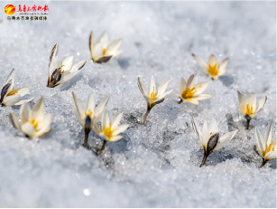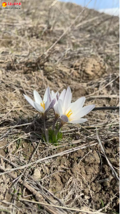 白番红花(Crocus alatavicusSemen. & Regel)宛如点点繁星,在雪水的润泽下破冰绽放。它们外紫内白,黄色的花蕊在风中轻轻摆动,一簇簇、一片片,清新又美好。