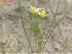 在沙漠这一特殊生境中,分布的是叉梗顶冰花,茎直立不分支,基生叶扁平,花被片黄色,顶端渐尖。