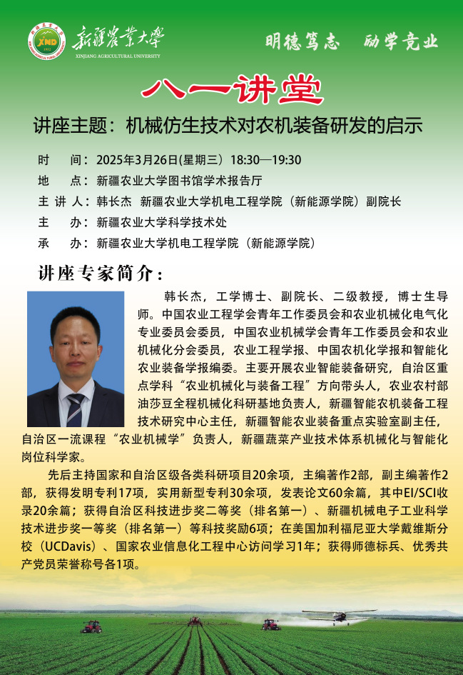 【八一讲堂预告】八十六期:机械仿生技术对农机装备研发的启示