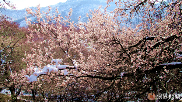 在天山野果林,当杏花与雪纷沓至来,自是别有一番风韵。受访者提供
