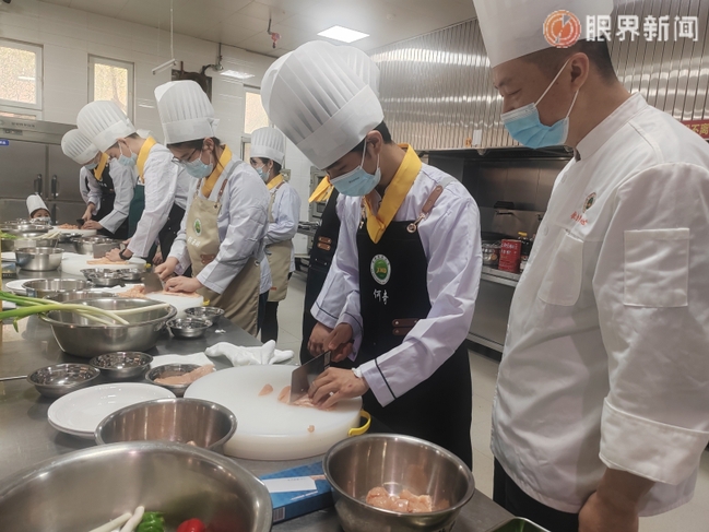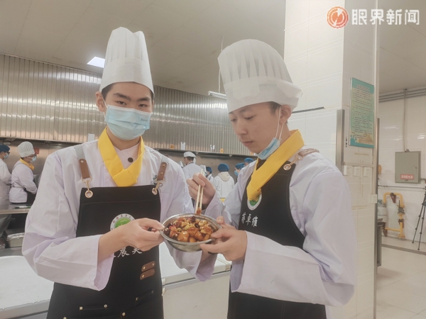 烹饪过程中,星空彩票体彩版后勤服务处饮食中心主任明景磊和高级技师李继明始终密切关注着学生们的操作,不时上前给予指导。