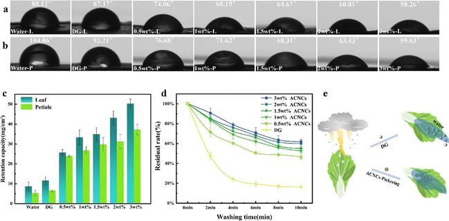 图2. 不同ACNCs含量的ACNCs-Pickering在大白菜叶片(a)和叶柄(B)上的接触角图像;不同ACNCs浓度下IMI@ ACNCs-Pickering的保留率(c);不同ACNCs含量的IMI@ACNCs-Pickering不同洗涤时间后在大白菜叶片上的IMI残留率(d); IMI@ ACNCs-Pickering在雨水洗涤的大白菜叶片上的示意图(e)。