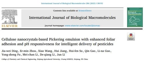 纤维素纳米晶(CNCs)作为源自纤维素的棒状纳米颗粒,凭借无毒、可生物降解和刚性等特点,近年被证实是皮克林乳液的理想稳定剂。其表面活性羟基可作为非共价吸附或化学接枝的锚定位点,这种特性使得CNCs能根据应用场景进行定向功能化开发。基于此类CNCs构建的皮克林乳液,可通过刺激响应机制实现农药供给与作物需求的动态平衡。