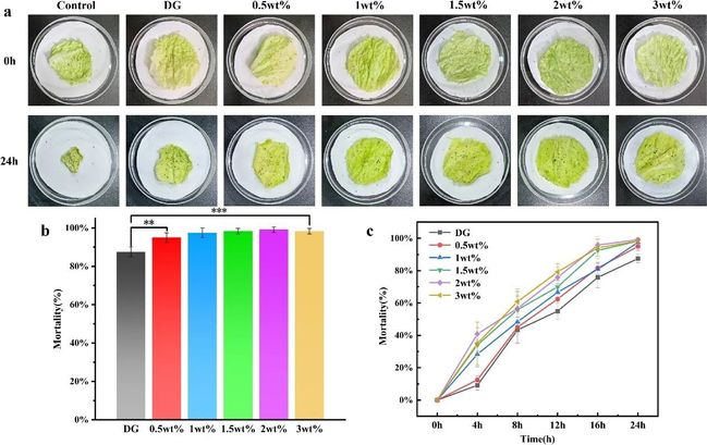 图3. IMI@ACNCs-Pickering(LC 50:20 mg/L)在不同ACNC浓度下对绿色桃蚜的杀虫效力(a)、24小时死亡率(B)和不同时期死亡率统计(c)的数字图像。