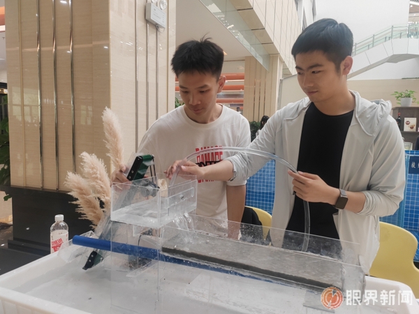 水利与土木工程学院大二卢浩然(左)带来的研究水工混凝土的冲磨损伤情况实验,吸引了不少人围观。记者江斌伟摄