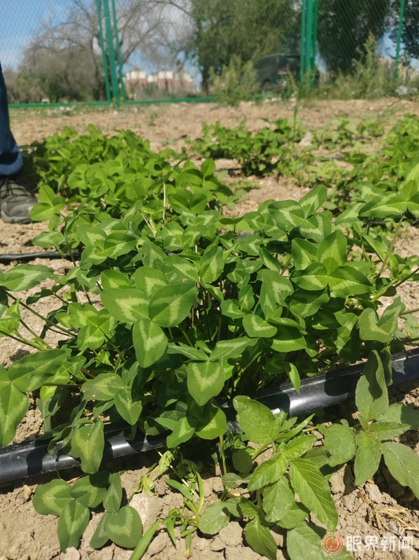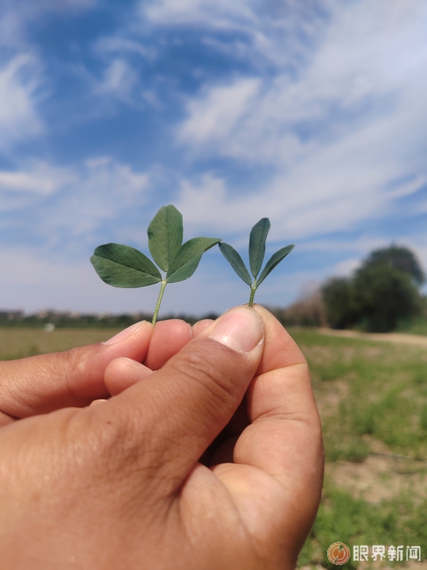 在这里,“太空种子”专区堪称“特殊存在”。今年五月,从天宫返回的紫花苜蓿、红三叶等五种牧草从温室移栽到此,已经在地里扎根生长,有些枝叶格外茂盛高大,叶片硕大,比普通的苜蓿要大三四倍。