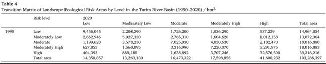 表4 塔里木河流域景观生态风险区各等级过渡矩阵(1990–2020)/hm2.