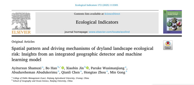 我校公共管理学院(法学院)阿依吐尔逊·沙木西团队与南京大学地理与海洋科学学院博士后金晓斌教授团队共同完成《旱地景观生态风险的空间格局与驱动机制:来自综合地理探测器和机器学习模型的见解》,在1区Top期刊《Ecological Indicators》发刊。