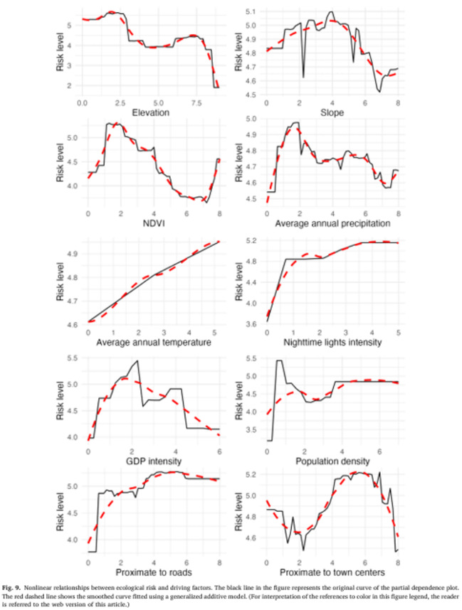 图9 生态风险与驱动因素之间的非线性关系。图中的黑线表示部分依赖图的原始曲线。
