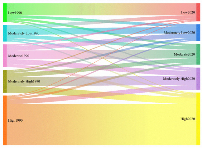 图6 1990-2020年塔里木河流域不同层次景观生态风险转移矩阵