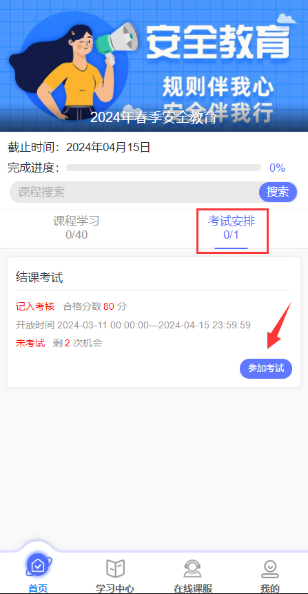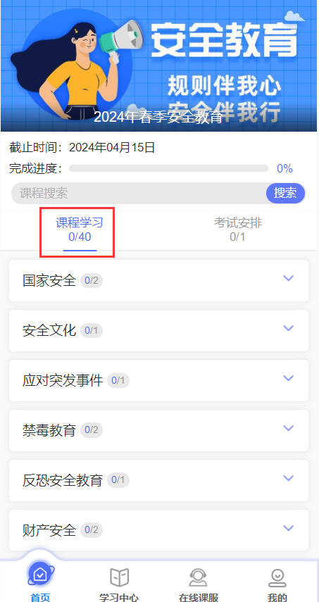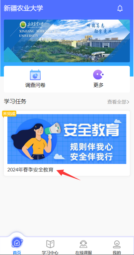 【首页】→【2024年春季安全教育】,进入课程学习;