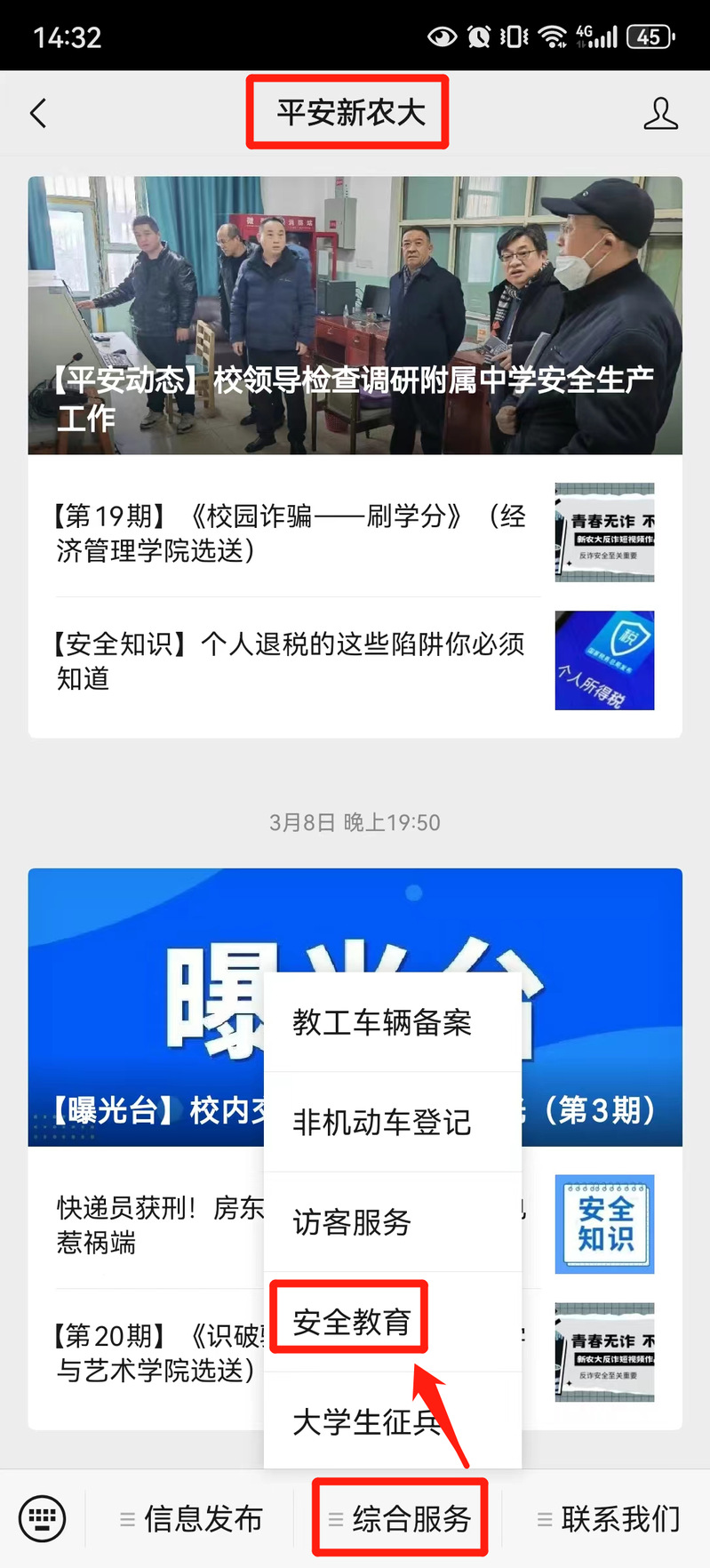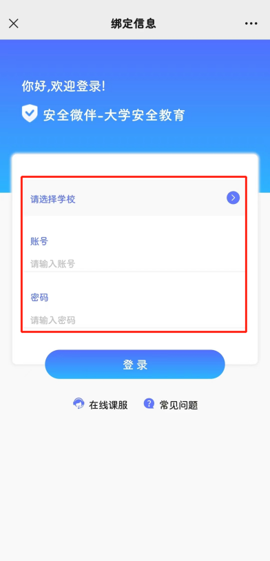 2.公众号菜单栏【综合服务】——【安全教育】——【开始学习】→请选择学校名称,输入账号、密码,点【登录】绑定信息,如更换微信号,则需重新绑定;