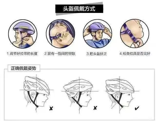 4.调整高度。应使耳朵的位置正好位于头盔两侧前后两个织带中间。