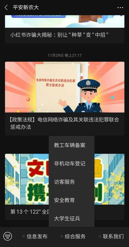 方法二:关注“平安新农大”微信公众号,点击综合服务栏中的大学生征兵可一键直达全国征兵网进行报名。