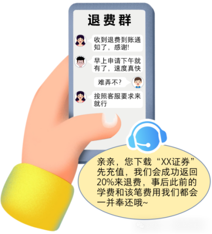 陈某收到某培训机构退费公告,显示“机构能力不足经营不善”“资金链断裂”“清退所有学费”“添加客服QQ办理”等内容,公告单上还有机构信用代码、地址等详细信息。陈某通过公告单上的二维码,添加客服QQ,根据客服发来链接下载了APP,并绑定银行卡进行充值。此时群里有很多所谓的“家长”陆续发布了“已收到退款”的信息,陈某因此打消了顾虑。正当她准备充值时,却收到了反诈中心的紧急预警信息,才避免了资金受损。