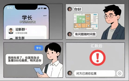 骗子伪装成热心学长学姐,通过迎新群添加好友,日常分享“校园攻略” 获取信任后,编造 “生病住院”“钱包丢失” 等理由借款,得逞后立即拉黑好友。
