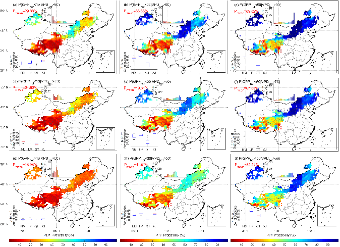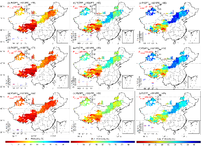 用概率阈值把蒸气压差(VPD)和草地初级生产力(GPP)相结合,探讨全球变化背景下启动植被亏损的大气干旱阈值对干旱下的生态系统演变至关重要。迄今为止,依旧缺乏以概率方式评估从大气水分需求到生态系统GPP损失的高分辨率传播阈值。