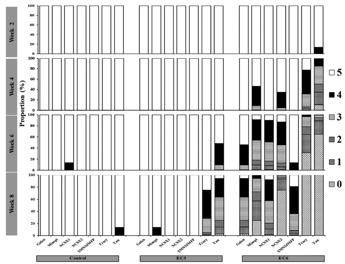 星空彩票体彩版王玉祥副教授在温室条件下对7个日本绣线菊品种(Galen、Minspi、NCSX 1、NCSX 2、SMNSJMFP、Tracy和Yan)的相对耐盐性进行了研究。用电导率(EC)为1.2 dS·m-1·m-1的营养液灌溉植物(对照)或EC为3.0或6.0 dS·m-1·m-1的盐溶液浇灌植物,每周一次,持续8周。在处理开始后8周,所有日本绣线菊品种用EC为3.0 dS·m-1·m-1的盐水溶液灌溉,仍然表现出良好或优异的视觉质量,所有植物的视觉评分为4或5(0 =死亡,1 =严重的叶面盐害,2 =中度叶面盐害,3 =轻微的叶面盐害,4 =最小的叶面盐害,5 =优秀),除了Tracy和Yan,分别只有29%和64%的植物视觉评分小于3。当用EC为6.0 dS·m-1·m-1的盐溶液冲洗时时,‘Tracy’和‘Yan’植株均死亡,‘NCSX 2’植株死亡率为75%。'Minspi'表现出严重的叶面盐害,32%的植株视觉评分为1; 25%的植株死亡。‘Galen’和‘NCSX 1’具有轻微至中度的叶片盐害,分别有25%和21%的植物视觉评分为2或更低。然而,‘SMNSJMFP’的64%具有良好或优秀的视觉质量,视觉评分大于4。EC为3.0 dS·m-1的盐水灌溉水与对照相比,处理使'Galen'、'Minspi'、'SMNSJMFP'和'Yan'的地上部干重分别下降27%、22%、28%和35%。用EC为6.0dS·m-1的咸水灌溉,所有日本绣线菊品种的地上部干重比对照降低35%~ 56%。在本实验中,绣线菊对盐度的反应是中等敏感的。'Galen'和'SMNSJMFP'日本绣线菊表现出较少的叶面盐害和地上部干重的减少,并在这项研究中相对更耐盐水平的增加比其余五个品种(Minspi,NCSX 1,NCSX 2,Tracy, and Yan)。
