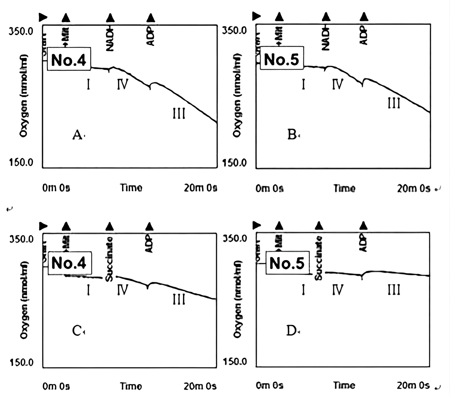 Fig. 4 Effect of low temperature on the respiration state of mitochondria in alfalfa roots. Respiration states of root mitochondria when NADH (A,B) and succinate (C,D), respectively, are used as substrate after LT treatment