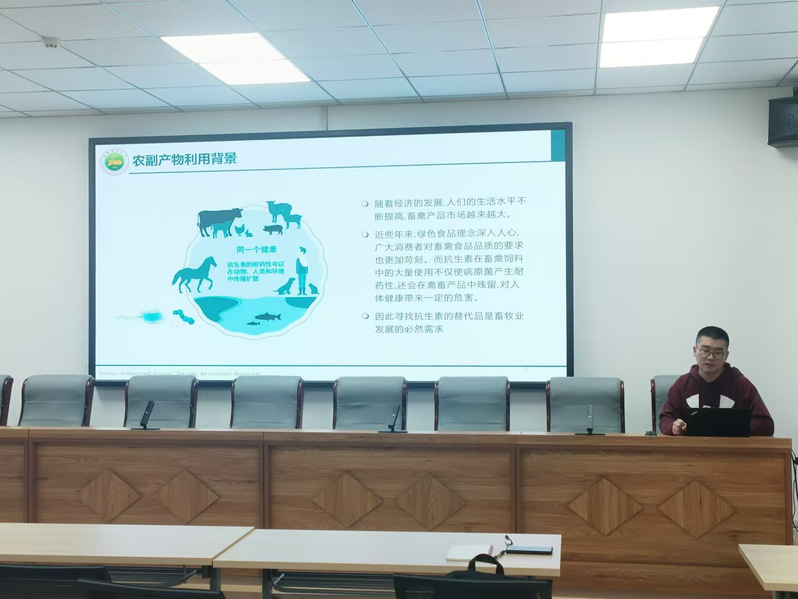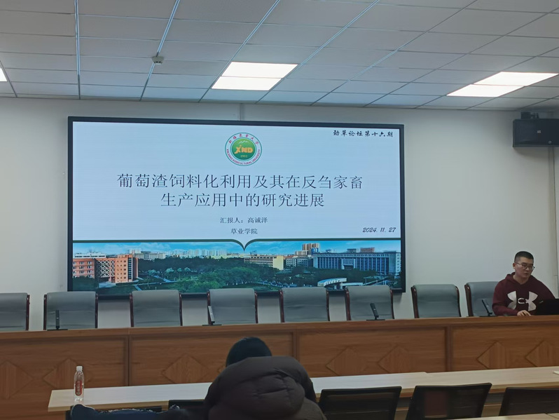 紧接着,在读博士研究生高诚泽以“葡萄渣饲料化利用及其在反刍家畜生产应用中的研究进展”为题目进行报告。高诚泽博士研究生详细介绍了葡萄渣这一资源再利用的巨大潜力,指出葡萄渣在反刍家畜生产中的优势,并分享了在研究过程中取得的研究成果以及对未来发展方向的展望。