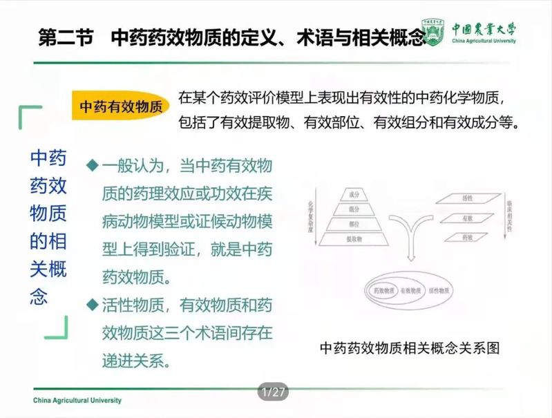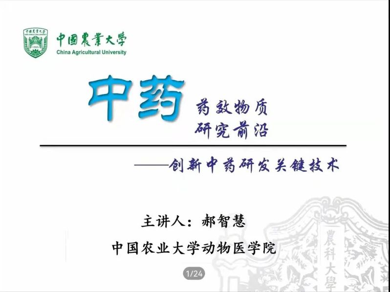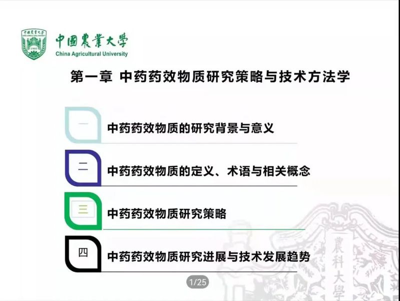 智慧教授从中药药效物质的研究背景与意义、药效物质的定义术语与相关概念、药效物质研究策略、药效物质研究进展与技术发展趋势四个大方面来为同学们进行讲述。