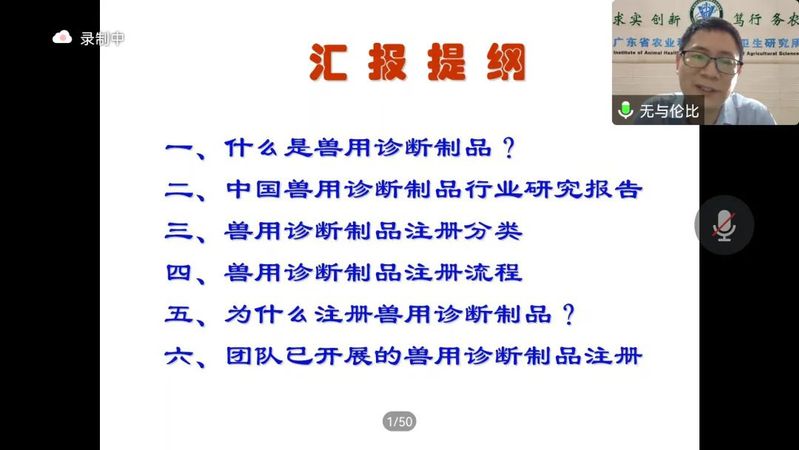 翟少伦研究员以适应新形势下兽用诊断制品注册办法,踔厉奋发研制动物疫病诊断新产品为题,分别从什么是兽药诊断制品、中国兽用诊断制品行业研究报告、兽用诊断制品注册分类等六方面对同学们进行了详细的讲解。