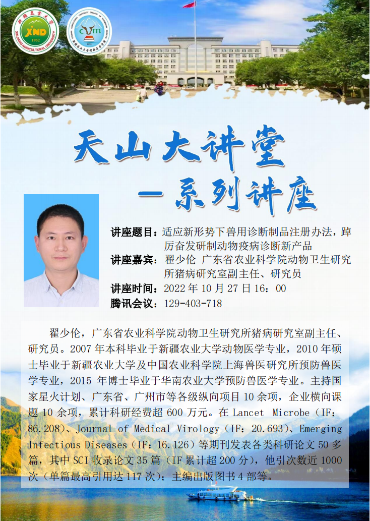 翟少伦研究员主持国家星火计划、广东省、广州市等各级纵向项目10余项,企业横向课题10余项,累计科研经费超600万元。此外,兼任BMC Veterinary Research、Frontier in Microbiology、Frontier in Veterinary Science杂志编委、副主编,以及Advanced Science、Transboundary and Emerging Diseases、Journal of Virology、Veterinary Microbiology等20多个国际期刊审稿人。