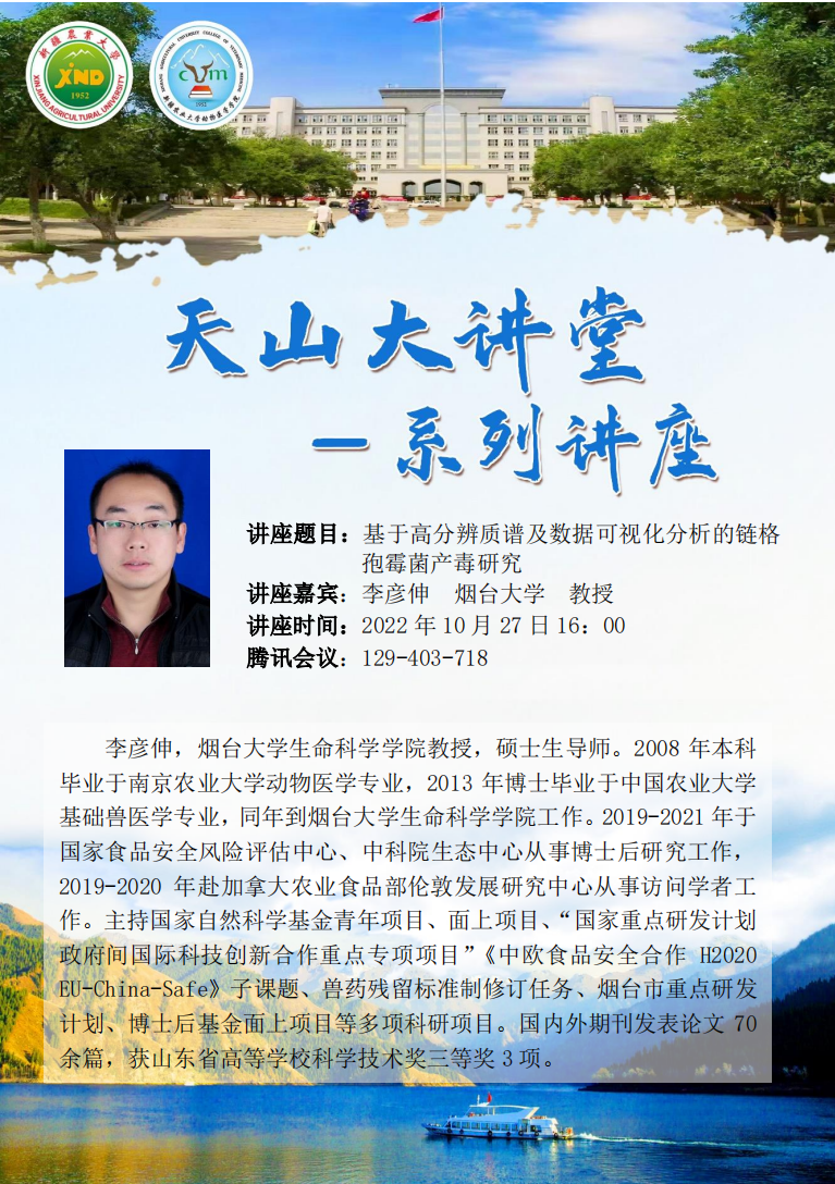 李彦伸教授的主要研究方向:食源性真菌毒素产生及代谢转化机制;药物残留分析及快速检测;微生物抗菌天然产物。主持国家自然科学基金青年项目、面上项目、“国家重点研发计划政府间国际科技创新合作重点专项项目”《中欧食品安全合作H2020 EU-China-Safe》子课题、兽药残留标准制修订任务、烟台市重点研发计划、博士后基金面上项目等多项科研项目。在Journal of Hazardous Materials, Food Chemistry, Journal of Agricultural and Food Chemistry, Journal of the Science of Food and Agriculture, Frontiers of Environmental Science & Engineering,《食品科学》,《中国畜牧兽医》等国内外期刊发表论文70余篇,获山东省高等学校科学技术奖三等奖3项,指导研究生40余人。