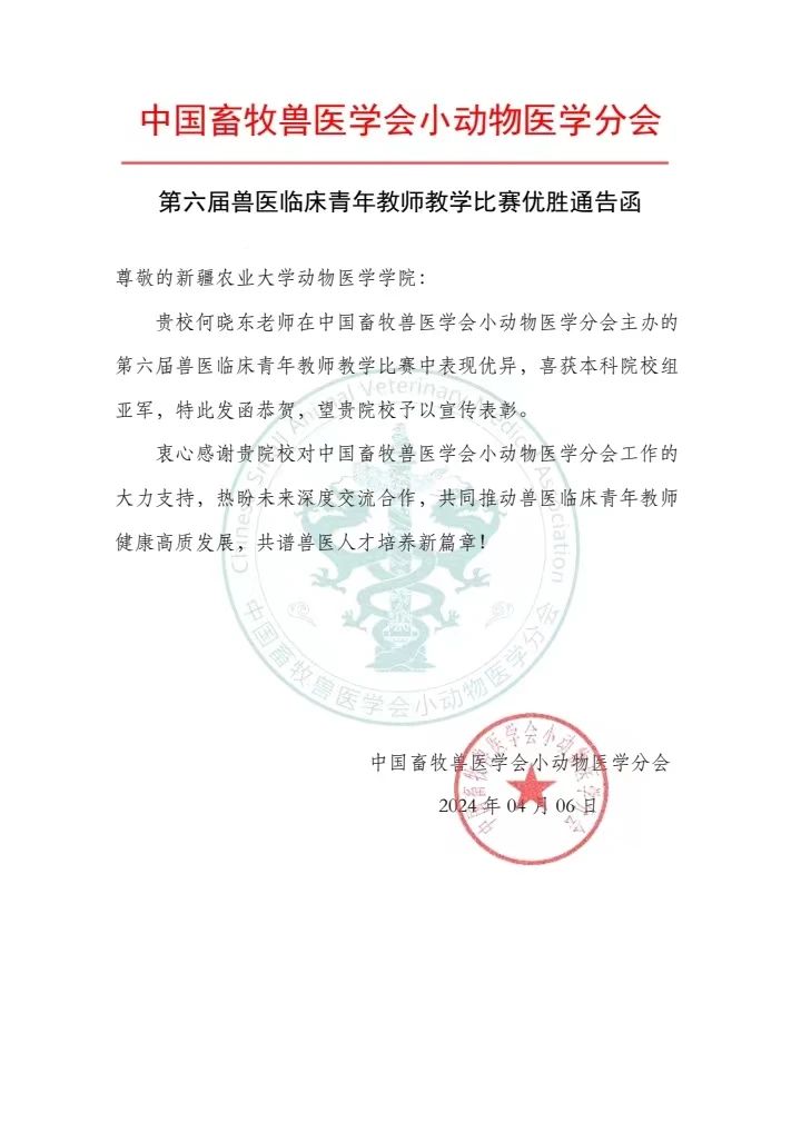 特此喜报!热烈祝贺何晓东老师荣获第六届兽医临床青年教师教学比赛本科院校组亚军