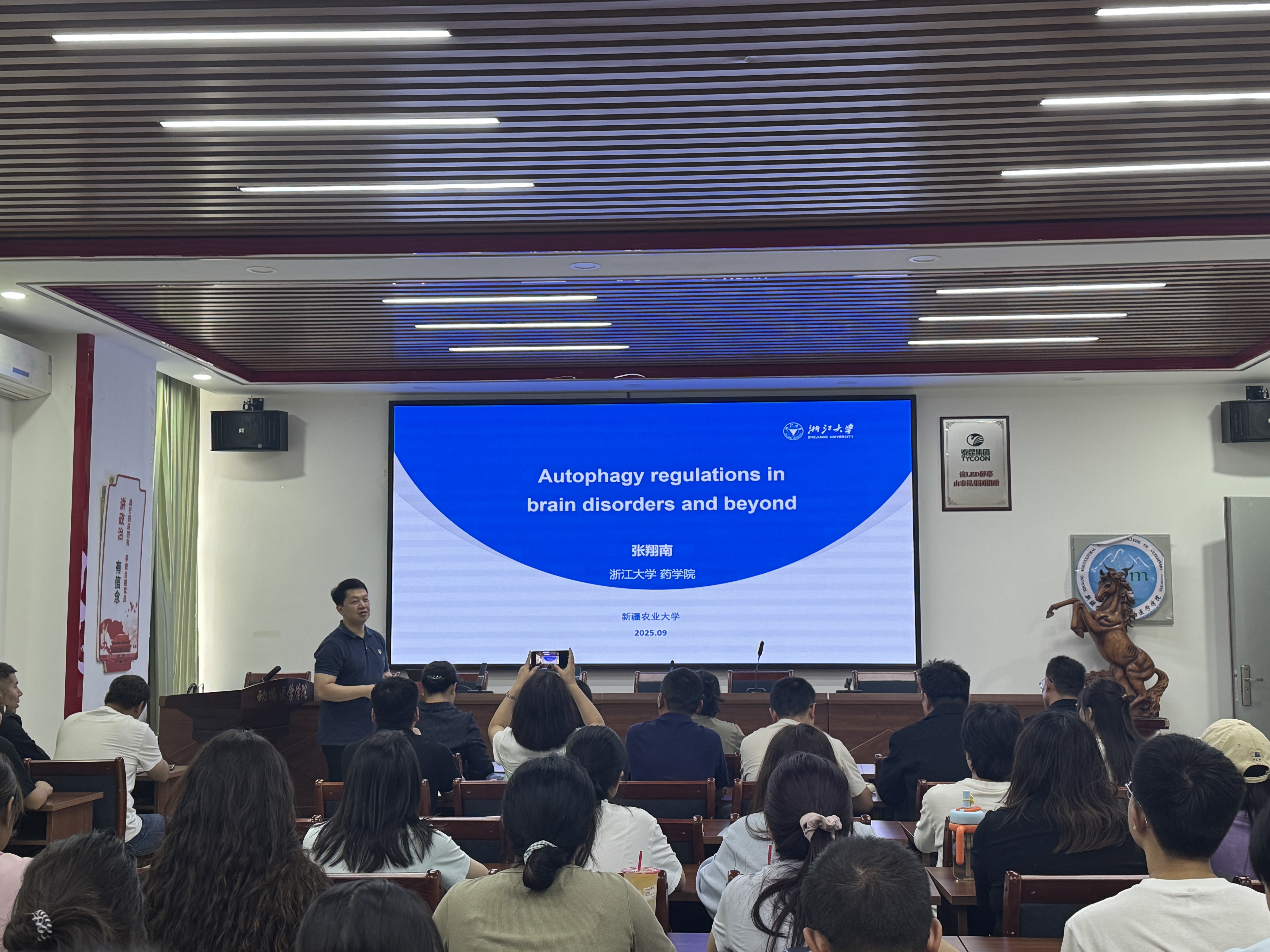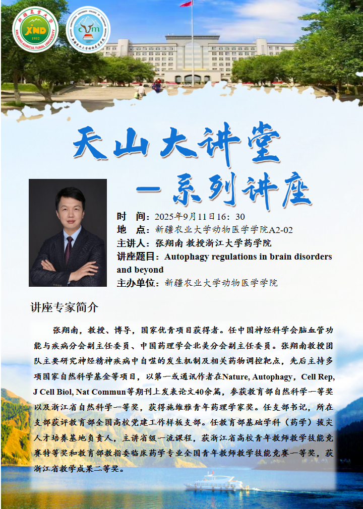2025年9月11日,由星空彩票体彩版动物医学学院主办的“天山大讲堂”系列学术讲座在学院A2-02教室顺利举行。本次讲座特邀浙江大学药学院张翔南教授担任主讲嘉宾,讲座主题为“Autophagy regulations in brain disorders and beyond”。会议由星空彩票体彩版动物医学学院郭庆勇院长主持。本次活动吸引了学院60余名师生参与,现场交流互动热烈。
